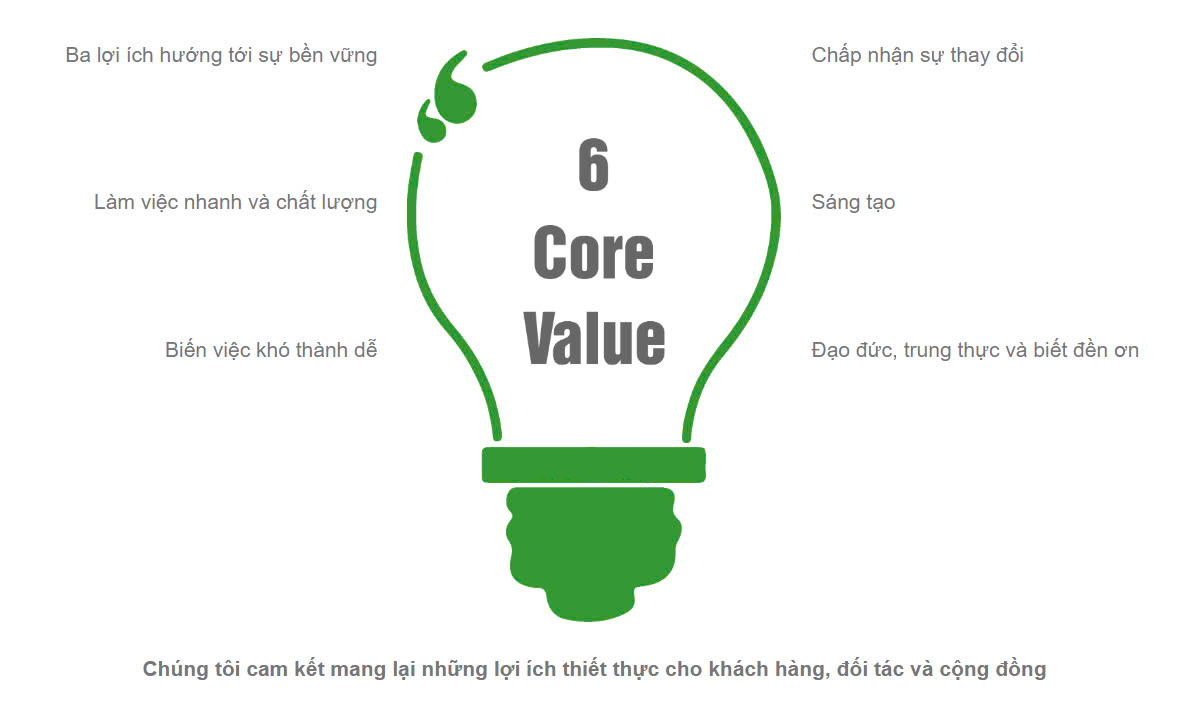 Chúng tôi luôn không ngừng hoàn thiện trong công việc, tận tụy với khách hàng, đối tác. Các hoạt động của chúng tôi dựa trên 6 giá trị cốt lõi của ban lãnh đạo đã đề ra